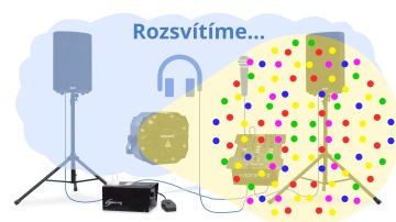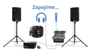 Součástí našeho audio setu je mixážní pult, kam připojíte jakýkoliv přehrávač spolu s mikrofonem a sluchátky. Sada aktivních reproboxů, světelný zdroj a přístroj na výrobu mlhy. Vše dohromady se dá použít jak v přednáškovém prostoru, tak ve velkém stanu a PitPatu. Snadno vytvoříte atmosféru, jakou budete chtít pro svou práci nebo párty.