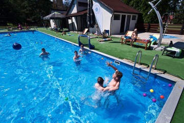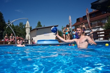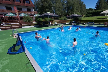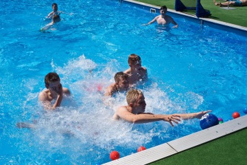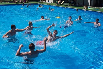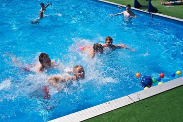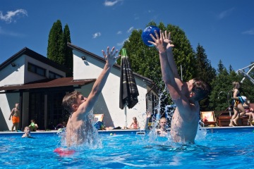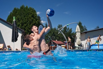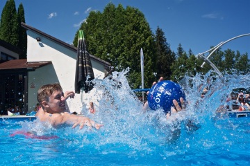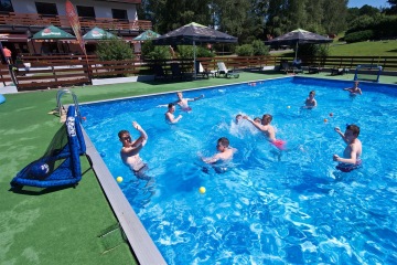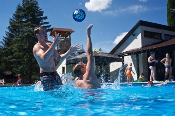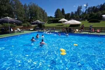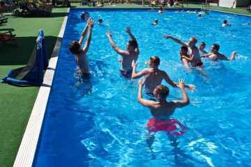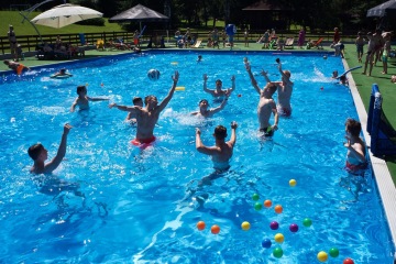 Letos jsme pořídili nové branky a míče. Branky můžete mít jak venku z vody na kraji bazénu, tak přímo na vodě. Míče máme v několika velikostech, tak si zahrajou malí i velcí.